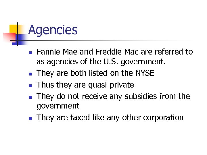 Agencies n n n Fannie Mae and Freddie Mac are referred to as agencies of the U. S. government. They are both listed on the NYSE Thus they are quasi-private They do not receive any subsidies from the government They are taxed like any other corporation
