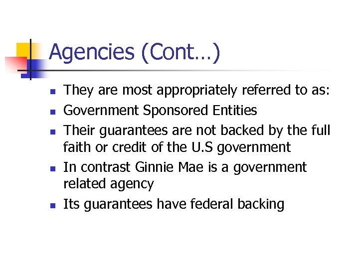 Agencies (Cont…) n n n They are most appropriately referred to as: Government Sponsored Entities Their guarantees are not backed by the full faith or credit of the U. S government In contrast Ginnie Mae is a government related agency Its guarantees have federal backing