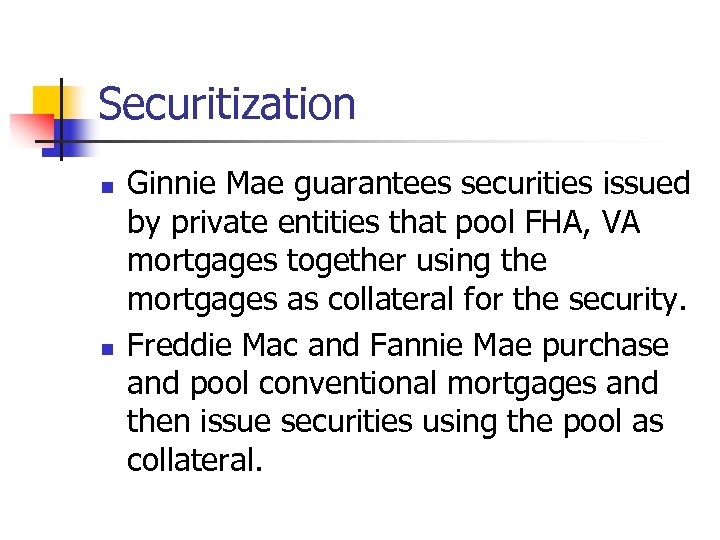 Securitization n n Ginnie Mae guarantees securities issued by private entities that pool FHA, VA mortgages together using the mortgages as collateral for the security. Freddie Mac and Fannie Mae purchase and pool conventional mortgages and then issue securities using the pool as collateral.