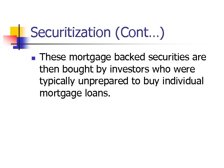 Securitization (Cont…) n These mortgage backed securities are then bought by investors who were typically unprepared to buy individual mortgage loans.
