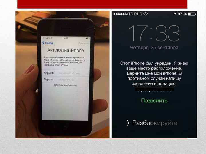 • С выходом i. OS 7 появилась возможность удалено блокировать аппарат через свой Apple ID в случаях, когда его украли или потеряли. Разблокировать такой аппарат невозможно, но при этом легко отслеживается его местонахождение на карте. Доверчивый покупатель покупает подержанный аппарат, а через день на него приходит сообщение «Этот телефон был украден. Я знаю ваше месторасположение. Позвоните на номер…и верните i. Phone, или я пишу заявление в полицию» #2