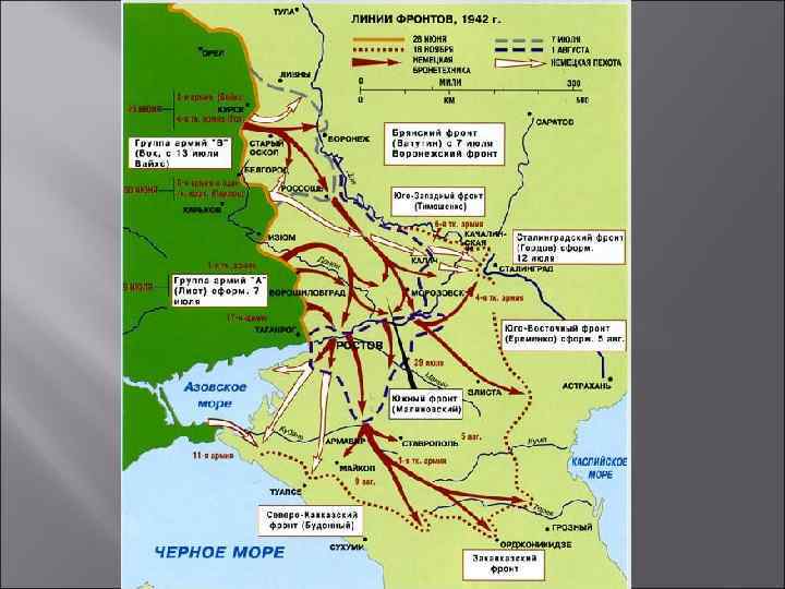 ХРОНИКА СРАЖЕНИЙ ВЕСНЫ – ЛЕТА 1942 ГОДА РЖЕВСКО – ВЯЗЕМСКАЯ НАСТУПАТЕЛЬНАЯ ОПЕРАЦИЯ – огромные потери, продвинулись на 80 - 250 км. 12 МАЯ – поражение под Харьковым. Фашистские войска занимают Донбасс КЕРЧЕНСКО – ФЕОДОСИЙСКАЯ ДЕСАНТНАЯ ОПЕРАЦИЯ – В МАЕ НАШИ ВОЙСКА РАЗГРОМЛЕНЫ В КРЫМУ Июль 1942 года – падение Севастополя 25 июля – ноябрь 1941 года – оборона Кавказа: немцы вышли к Эльбрусу, заняли большую часть Новороссийска и Таманский полуостров 7 января – 30 апреля 1942 года - на северо – западе – Любанская наступательная операция: окружение 2 ударной армии –потери 403 тыс. человек ВЕРМАХТ ВЫШЕЛ К СЕВЕРНОМУ КАВКАЗУ И ВОЛГЕ