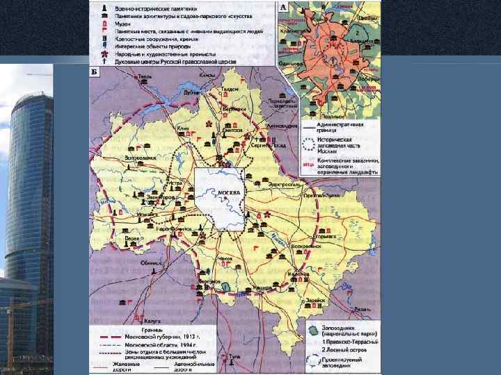 • Близ границы области расположены древние города. На юге, при впадении реки Москвы в Оку, лежит Коломна — промышленный (производство тепловозов), научный и транспортный центр с древним кремлем. Серпухов, также лежащий на Оке, — научно-производственный центр. В городе сохранились остатки кремля. Близ города находится Приокско-Террасный биосферный заповедник. На севере области расположен город Дмитров, как и Москва, основанный Юрием Долгоруким. Это центр промышленности и культуры, порт на канале им. Москвы. Пользуясь атласом, выясните, где в основном находятся историкокультурные памятники и охраняемые территории Подмосковья.