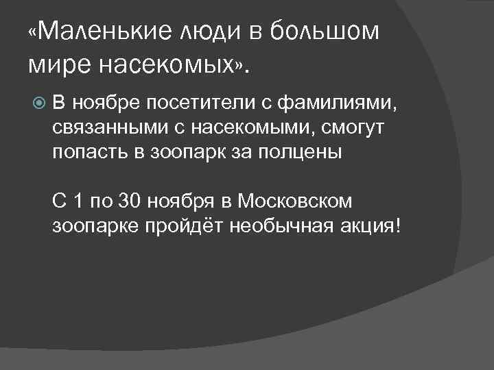 «Маленькие люди в большом мире насекомых» . В ноябре посетители с фамилиями, связанными с насекомыми, смогут попасть в зоопарк за полцены С 1 по 30 ноября в Московском зоопарке пройдёт необычная акция!