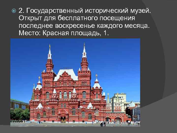 2. Государственный исторический музей. Открыт для бесплатного посещения последнее воскресенье каждого месяца. Место: Красная площадь, 1.