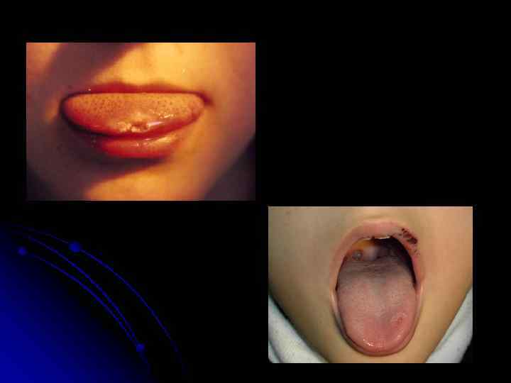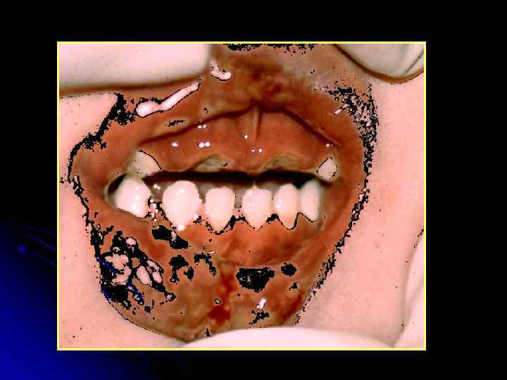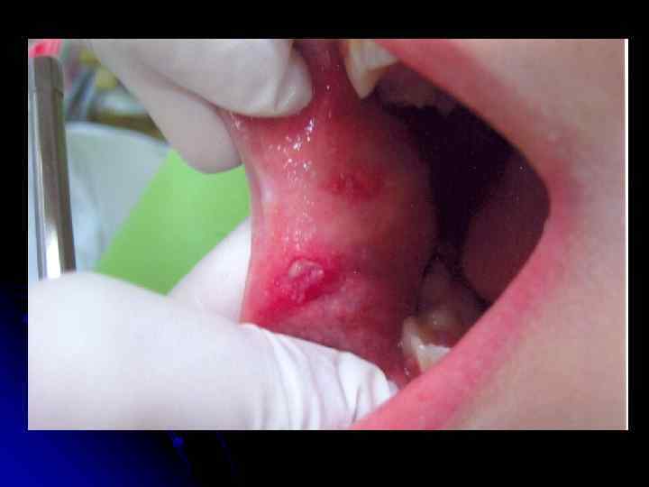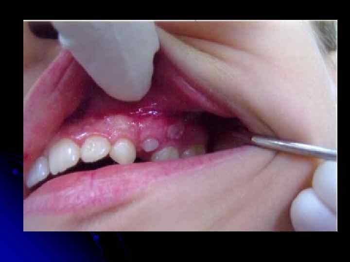 Тяжелая форма ОГС l l Резко выраженные симптомы интоксикации Повышение температуры тела до 39 -40 о. С Язвенно-некротический гингивит в области всех зубов Элементов высыпания - до 100, которые сливаются, образуя участки некроза