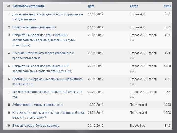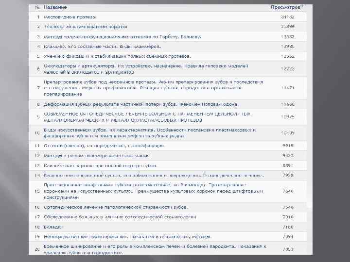 В разделе СТОМАТОЛОГАМ имеется 68 научных статей по ортопедии. Вот ТОП-10 статей набравших наибольшее количество “ХИТОВ”: