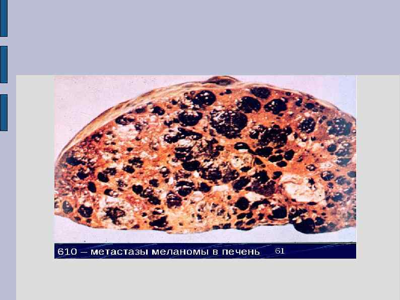 Метастазирование Лимфогенный путь — в регионарные лимфатические узлы Гематогенный путь — в кости, печень, головной мозг, легкие Меланому называют королевой опухолей за ее очень быстрое метастазирование !!!