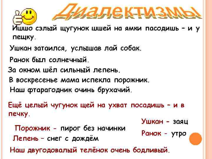 ОГРАНИЧИННАЯ УПОТРЕБЛЯЕМОСТЬ Диалектизм — более узкие термины традиционной стилистики: «вульгаризм» , «провинциализм» и другие, и обозначающий слово или выражение всякого диалекта, для территориального или социального, введенное в литературный язык. Диалектизмы — выражения или способы речи, употребляемые людьми той или иной местности. Примеры: Хутор, поребрик. (См. также различия речи москвичей и петербуржцев) Лексика современного русского языка имеет ряд диалектов как на территории современной России, так и на территории других государств. Диалектизмы имеют свои специфические особенности. Скажем, диалектизмам русского языка в Беларуси присущи такие фонетические явления, как «аканье» и «дзеканье» . Существуют специальные словари, которые включают в себя диалектизмы той или иной местности. Эти словари называются словарями диалектных слов. Профессиональная лексика – это лексика, свойственная данной профессиональной группе, используемая в речи людей, объединенных общей профессией. Балда (тяжелый молот для раздробления камней и горных пород)— в речи горняков. Камбуз (кухня на судне), кок (повар) — в речи моряков. Шпон (тонкая металлическая пластинка, вставляемая между строками набора для увеличения расстояния между ними), полоса (набранная или уже напечатанная страница), шапка (общий заголовок для нескольких заметок) — в речи полиграфистов. В речи охотников встречаются такие названия зайцев в зависимости от времени помета: яровик (заяц весеннего помета), листняк, травник (летнего), листо-падник (осеннего), наставник (раннего зимнего). Любители певчих птиц употребляют такие названия колен соловьиного пения; гусачок, дробь, клыканье, кукушкин перелет, лешева дудка, оттолчка, пленканье, почин, пульканье, раскат, свист, стукотня, трель, юлиная стукотня.