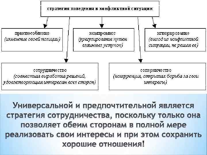 СТРАТЕГИЯ ПОВЕДЕНИЯ В МЕЖДУНАРОДНЫХ КОНФЛИКТАХ 1. Подавление: соперничество, конкуренция, открытая борьба за свои интересы, отстаивание своей позиции 2. Приспособление: изменение своей позиции, перестройка поведения, сглаживание противоречий, отказ от своих интересов 3. Уход: уклонение от конфликта, стремление выйти из конфликтной ситуации, не разрешая ее 4. Компромисс: урегулирование разногласий через взаимные уступки 5. Сотрудничество: совместный поиск решения, удовлетворяющего интересы обеих сторон