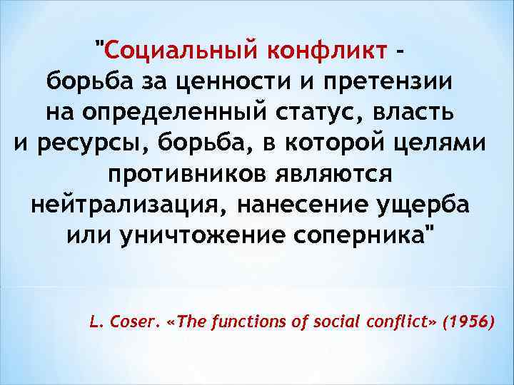 "Социальный конфликт борьба за ценности и претензии на определенный статус, власть и ресурсы, борьба, в которой целями противников являются нейтрализация, нанесение ущерба или уничтожение соперника" L. Coser. «The functions of social conflict» (1956)