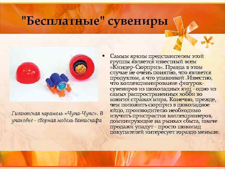 "Бесплатные" сувениры • Самым ярким представителем этой группы является известный всем «Киндер Сюрприз» . Правда в этом случае не очень понятно, что является продуктом, а что упаковкой. Известно, что коллекционирование фигурок сувениров из шоколадных яиц одно из самых распространенных хобби во многих странах мира. Конечно, прежде, чем положить сюрприз в шоколадное яйцо, производителю необходимо Гигантская карамель «Чупа-Чупс» . В изучить пристрастия коллекционеров, упаковке - сборная модель батискафа доминирующие на рынках сбыта, иначе продажи упадут просто шоколад покупателей интересует гораздо меньше.
