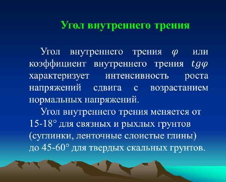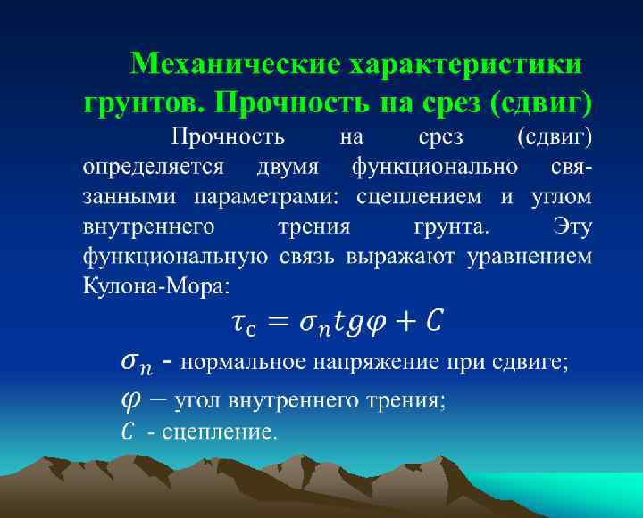 Сцепление характеризует предельное сопротивление срезу по площадке, на которой отсутствует нормальное давление, т. е. нет сопротивления срезающим усилиям за счет внутреннего трения. Величина сцепления различных грунтов меняется в пределах от сотых долей (глины, мергели, слабо сцементированные песчаники и др. ) до нескольких десятков мегапаскалей (прочные песчаники, граниты, базальты).