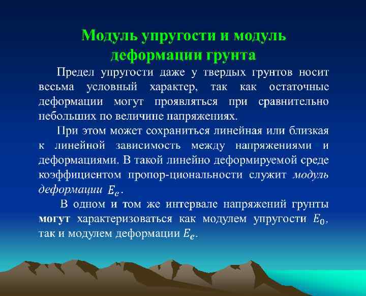 Упругое деформирование грунтов Упругое деформирование представляет собой частный случай поведения грунтов до некоторого значения напряжений, называемого пределом упругости. В этих пределах нагружения деформации носят чисто упругий характер и исчезают после снятия нагрузки (т. е. испытуемый образец восстанавливает первоначальную форму).