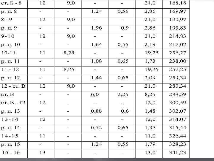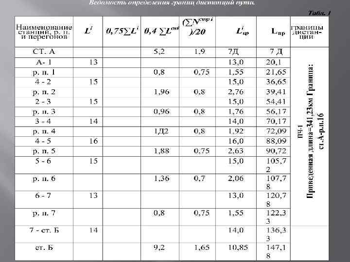 Часть 1. Деление полигона сети на дистанции и определение контингента монтёров пути. 1. 1 Определение границ дистанции пути на полигоне сети. Деление полигона сети на дистанции производится исходя из условия, что приведённая длина одной дистанции пути должна составлять 300 420 км. Lпрпч =300 420 км Приведенная длина дистанции пути определяется по формуле : Lпр=1, 0 • LI +0, 75∑Li +0. 4∑Lcmi +(∑Ncmp i )/20 +(100*∑Lucoi) (1, 1) Lnp- приведённая длина полигона сети, L 1 LI длина первого главного пути, ∑Li суммарная длина других главных путей, ∑Lcmi суммарная длина станционных путей, ∑Ncmpi суммарное количество стрелочных переводов, ∑Lucoi суммарная протяженность ИСО. Расчет Lnp представлен в табл. 1.