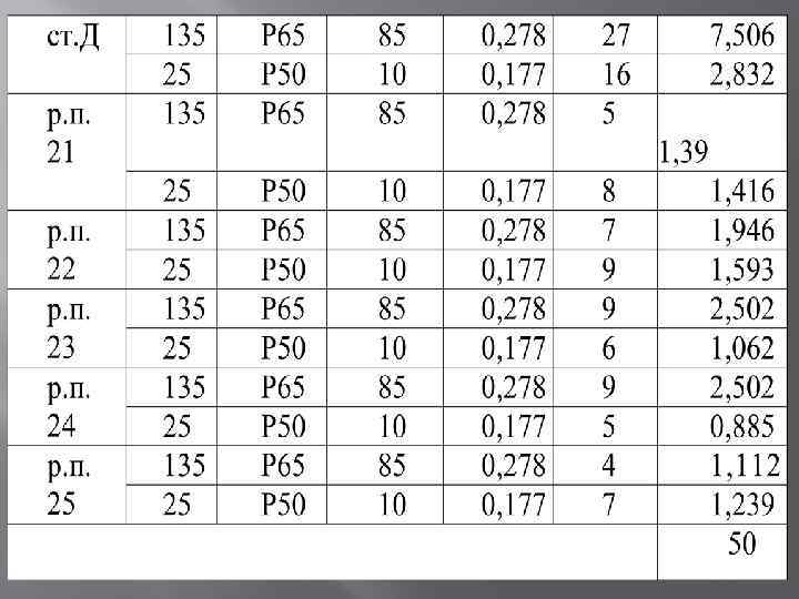 Контингент монтёров пути на механизированное текущее содержание стрелочных переводов определяется на основании дифференцированных норм затрат труда на текущее содержание главных путей (приказ 8 Ц, приложение 1, таблица 3). На стрелочных переводах, которые лежат на прочих путях имеем следующие эксплутационные данные: То=10 млн. тбркм/км год, V=25 км/ч. Расчёт приведён в следующей таблице 4. Число монтёров пути на механизированное текущее содержание стрелочных переводов составляет Nмехстр =50 монтёров пути.