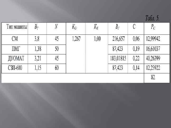 ВГ = ВТ • N • КО • КК (1, 11) ВТ техническая норма выработки машин в трёхчасовые «окна» на бесстыковом пути, К 0 - поправочный коэффициент, учитывающий продолжительность «окон» (приказ 8 Ц, приложение 1, таблица 8), КО - коэффициент, зависящий от конструкции пути (для б/с пути 1) N - расчетное количество «окон» для данной машины в год. Расчёт приведён в таблице 5.