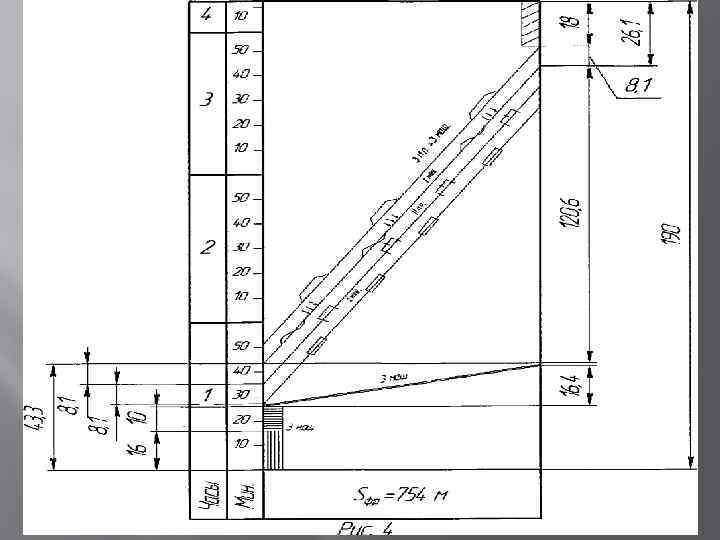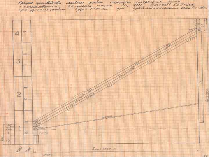 2. 3. График производства основных работ текущего содержания пути с использованием комплекса машин в составе: СМ, ПМГ, ДУОМАТ, СЗП-600 при фронте работ 8 фр=1, 830 км при продолжительности окна Ток= 3, 67 ч. По данным табл. 6 на миллиметровой бумаге строится график производства основных работ текущего содержания пути с использованием комплекса машин. При этом используются следующие масштабы: вертикальный 1 см = 10 мин; горизонтальный 1 см = 100 м. Данный график представлен на рис. 4.