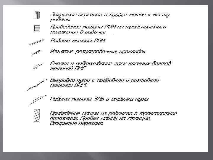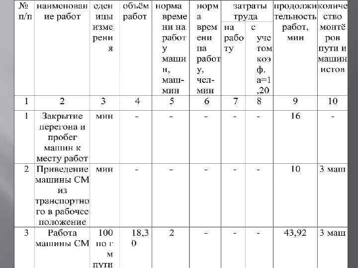 Переходим на машинизированный комплекс с использованием машин СМ, ПМГ, ДУОМАТ, СЗП 600. Время «окна» рассчитывается по следующей формуле: Tок = t разв+ tзв + t св (2, 1) tразв=t 1+t 2+t 3+t 4+t 5 время на развёртывание (2. 2) t 1= 16 мин интервал времени необходимый на закрытие перегона и пробег машин к месту работ; t 2= 10 мин интервал времени, необходимый на приведение машины СМ из транспортного в рабочее положение; t 3 интервал времени между началом работы машины СМ и началом работы бригады по изъятию регулировочных прокладок;