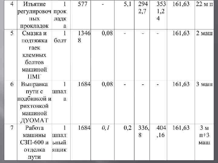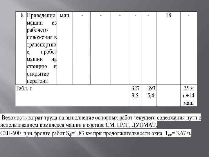 2. 2 Ведомость затрат труда на выполнение основных работ текущего содержания пути с использованием комплекса машин в составе: СМ, ПМГ, ДУОМАТ, СЗП 600 при фронте работ Sфр=1, 830 км при продолжительности окна Ток= 3, 67 ч. Расчет данной ведомости представлен в табл. 6.