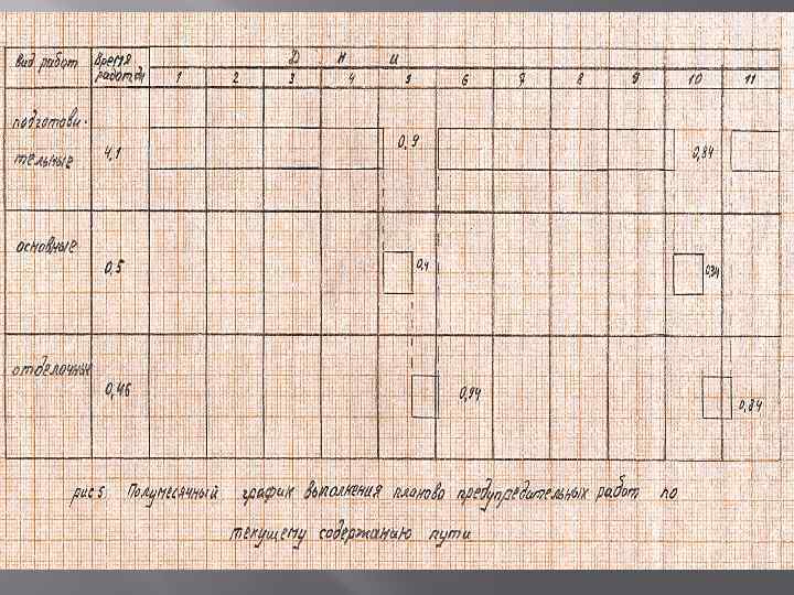 Для построения данного графика нужно найти время, необходимое на выполнение подготовительных Тпод , основных Тосн и отделочных Тотд планово предупредительных работ. Тпод= Аппрпод / n • 480 (2, 11) Тотд= Аппротд / n • 480 (2, 12) Тосн= Ток / 480 (2, 13) Тпод = 49188/25 • 480=4, 1 дня; Тотд = 6105 /25 • 480= 0, 5 дня; Тосн = 220 / • 480 = 0, 46 дня. По полученным данным строится полумесячный график выполнения планово предупредительные работы по текущему содержанию пути (см рис. 5).