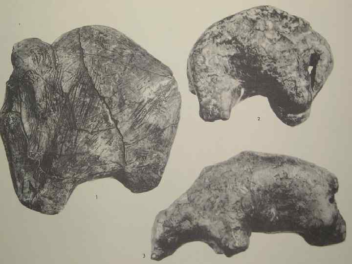 Позднепалеолитические художники делали фигурки не только нагих женщин, но и, в редких случаях, нагих мужчин. Из их рук выходили также прекрасные фигурки животных, найденные в больших количествах на местах стоянок в различных странах, включая Чехословакию. Из стоянки охотников на мамонтов в Пршедмости близ Пршерова происходит прекрасная фигурка мамонта, вырезанная из его же бивня (см. на рисунке изображение 1). Много скульптурных изображений, изготовленных из того же материала, было найдено на стоянке охотников на мамонтов в Дольних Вестоницах: фигурки пещерного медведя, дикой лошади, шерстистого носорога, мамонта, росомахи, северного оленя, снежной совы (см. на рисунке изображения 2 и 3). В вестоницкой ископаемой глиптотеке скульптур зверей очень интересна голова северного оленя. Она художественно изображена группировкой геометрических выгравированных линий, на темени головы — поперечных, по бокам головы — продольных, причем глаза, уши и лоб обозначены выпуклостями. Ясно, что на стилизации этой головы животного проявилось влияние восточного (украинского) центра ориньякского искусства, которое на вестоницкого художника подействовало сильнее, чем западное (французское). И в других местах были найдены фигурки животных, во многих случаях прекрасно выполненные и изображающие животных в определенных позах или в какой-нибудь жизненной ситуации. Так, например, изумительная скульптура дикой лошади происходит из Лурда (Франция). В Мас д'Азиль, также во Франции, была найдена удивительная, очень реалистически изображенная голова ржущей дикой лошади, вырезанная из рога оленя. Из Бруникеля (Франция) известны резные изображения бегущих северных оленей, сделанные на бивне мамонта. Многие фигурки, на которых выгравированы стрелы, являются ясным доказательством того, что они служили, прежде всего, в качестве предметов магического охотничьего культа. На рисунке: 1 — фигурка мамонта из его бивня, найденная в Пршедмости близ Пршерова в Моравии (Чехословакия); 2 и 3 — фигурки детеныша мамонта и пещерного медведя из модельной массы, Дольние Востоницы в Моравии (Чехословакия). Все скульптуры — из граветтской (позднеориньякской) фазы.