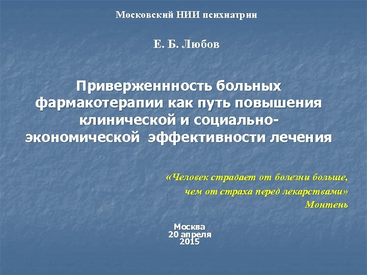 Московский НИИ психиатрии Е. Б. Любов Приверженнность больных фармакотерапии как путь повышения клинической и социальноэкономической эффективности лечения «Человек страдает от болезни больше, чем от страха перед лекарствами» Монтень Москва 20 апреля 2015