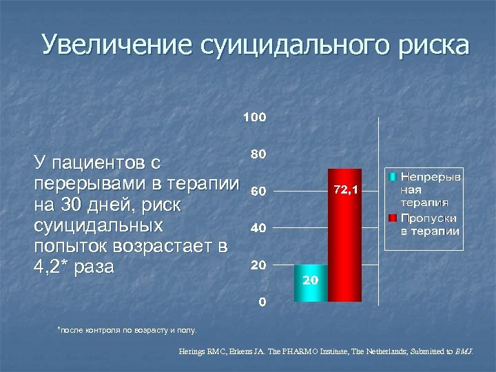 Увеличение суицидального риска У пациентов с перерывами в терапии на 30 дней, риск суицидальных попыток возрастает в 4, 2* раза *после контроля по возрасту и полу. Herings RMC, Erkens JA. The PHARMO Institute, The Netherlands; Submitted to BMJ.