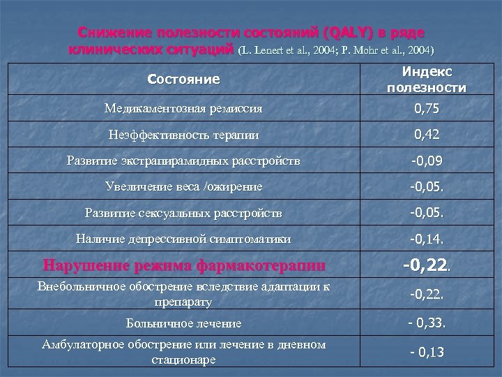 Снижение полезности состояний (QALY) в ряде клинических ситуаций (L. Lenert et al. , 2004; P. Mohr et al. , 2004) Состояние Индекс полезности Медикаментозная ремиссия 0, 75 Неэффективность терапии 0, 42 Развитие экстрапирамидных расстройств -0, 09 Увеличение веса /ожирение -0, 05. Развитие сексуальных расстройств -0, 05. Наличие депрессивной симптоматики -0, 14. Нарушение режима фармакотерапии -0, 22. Внебольничное обострение вследствие адаптации к препарату -0, 22. Больничное лечение - 0, 33. Амбулаторное обострение или лечение в дневном стационаре - 0, 13
