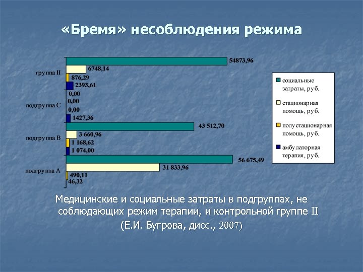 «Бремя» несоблюдения режима Медицинские и социальные затраты в подгруппах, не соблюдающих режим терапии, и контрольной группе II (Е. И. Бугрова, дисс. , 2007)