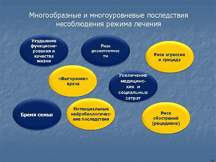 Многообразные и многоуровневые последствия несоблюдения режима лечения Ухудшение функционирования и качества жизни Риск резистентнос ти «Выгорание» врача Бремя семьи Потенциальные нейробиологические последствия Риск агрессии и суицида Увеличение медицинских и социальных затрат Риск обострений (рецидивов) 14
