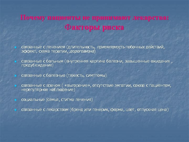 Почему пациенты не принимают лекарства: Факторы риска n связанные с лечением (длительность, приемлемость побочных действий, эффект, схема терапии, дороговизна) n связанные с больным (внутренняя картина болезни, завышенные ожидания , предубеждение) n связанные с болезнью (тяжесть, симптомы) n связанные с врачом ( «выгорание» , отсутствие эмпатии, союза с пациентом, нерегулярное наблюдение) n социальные (семья, стигма лечения) n связанные с лекарством (бренд или генерик, форма, цвет, отпускная цена)