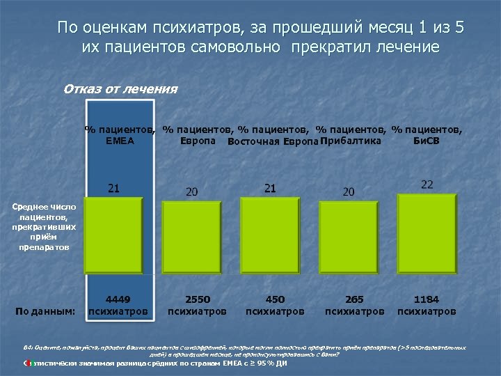 По оценкам психиатров, за прошедший месяц 1 из 5 их пациентов самовольно прекратил лечение Отказ от лечения % пациентов, % пациентов, EMEA Европа Восточная Европа Прибалтика Би. СВ Среднее число пациентов, прекративших приём препаратов По данным: 4449 психиатров 2550 психиатров 450 психиатров 265 психиатров 1184 психиатров В 4: Оцените, пожалуйста, процент Ваших пациентов с шизофренией, которые могли полностью прекратить приём препаратов (>5 последовательных дней) в прошедшем месяце, не проконсультировавшись с Вами? Статистически значимая разница средних по странам EMEA с ≥ 95% ДИ