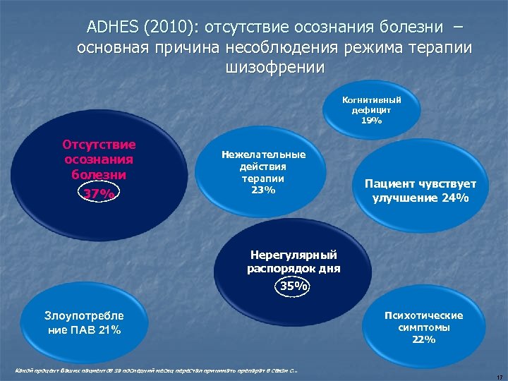 ADHES (2010): отсутствие осознания болезни – основная причина несоблюдения режима терапии шизофрении Когнитивный дефицит 19% Отсутствие осознания болезни 37% Нежелательные действия терапии 23% Пациент чувствует улучшение 24% Нерегулярный распорядок дня 35% Злоупотребле ние ПАВ 21% Психотические симптомы 22% Какой процент Ваших пациентов за последний месяц перестал принимать препарат в связи с. . . 17
