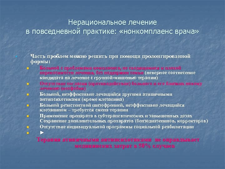 Нерациональное лечение в повседневной практике: «нонкомплаенс врача» Часть проблем можно решить при помощи пролонгированной формы: w n n n n Больной с проблемами комплаенса, не сводящимися к плохой переносимости лечения, без поддержки семьи (неверное соотнесение кандидата на лечение с группой-мишенью терапии) Отсутствие согласия (противодействие) больного и его близких новому лечению (неофобия) Больной, неэффективно лечащийся другими атипичными антипсихотиками (кроме клозапина) Больной резистентной шизофренией, неэффективно лечащийся клозапином – требуется смена терапии Применение препарата в субтерапевтических и завышенных дозах Сохранение дополнительных препаратов (бензодиазепинов, корректоров) Отсутствие индивидуальной программы социальной реабилитации ► Терапия атипичными антипсихотиками не оправдывает медицинских затрат в 50% случаев