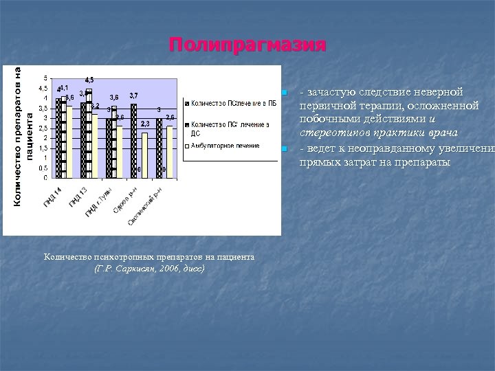 Полипрагмазия n n Количество психотропных препаратов на пациента (Г. Р. Саркисян, 2006, дисс) - зачастую следствие неверной первичной терапии, осложненной побочными действиями и стереотипов практики врача - ведет к неоправданному увеличению прямых затрат на препараты