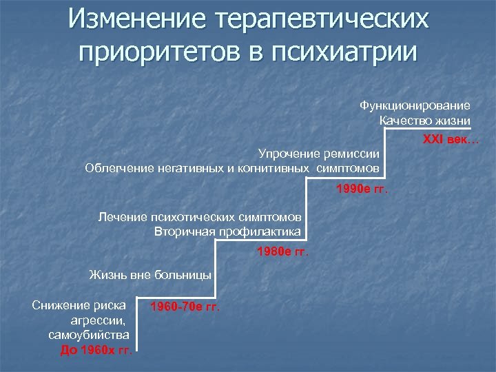 Изменение терапевтических приоритетов в психиатрии Функционирование Качество жизни ХХI век… Упрочение ремиссии Облегчение негативных и когнитивных симптомов 1990 е гг. Лечение психотических симптомов Вторичная профилактика 1980 е гг. Жизнь вне больницы Снижение риска агрессии, самоубийства До 1960 х гг. 1960 -70 е гг.