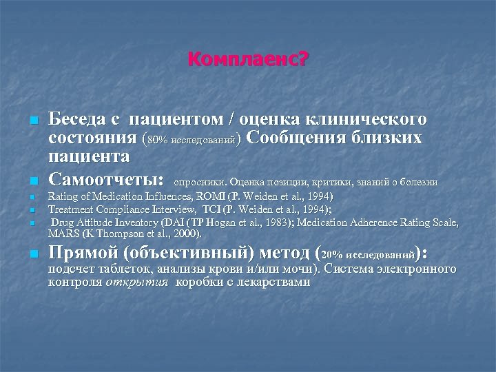 Комплаенс? n n n Беседа с пациентом / оценка клинического состояния (80% исследований) Сообщения близких пациента Самоотчеты: опросники. Оценка позиции, критики, знаний о болезни Rating of Medication Influences, ROMI (P. Weiden et al. , 1994) Treatment Compliance Interview, TCI (P. Weiden et al. , 1994); Drug Attitude Inventory (DAI (TP Hogan et al. , 1983); Medication Adherence Rating Scale, MARS (K Thompson et al. , 2000). Прямой (объективный) метод (20% исследований): подсчет таблеток, анализы крови и/или мочи). Система электронного контроля открытия коробки с лекарствами