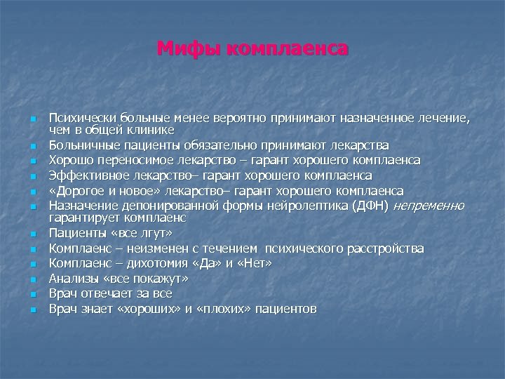 Мифы комплаенса n n n Психически больные менее вероятно принимают назначенное лечение, чем в общей клинике Больничные пациенты обязательно принимают лекарства Хорошо переносимое лекарство – гарант хорошего комплаенса Эффективное лекарство– гарант хорошего комплаенса «Дорогое и новое» лекарство– гарант хорошего комплаенса Назначение депонированной формы нейролептика (ДФН) непременно гарантирует комплаенс Пациенты «все лгут» Комплаенс – неизменен с течением психического расстройства Комплаенс – дихотомия «Да» и «Нет» Анализы «все покажут» Врач отвечает за все Врач знает «хороших» и «плохих» пациентов