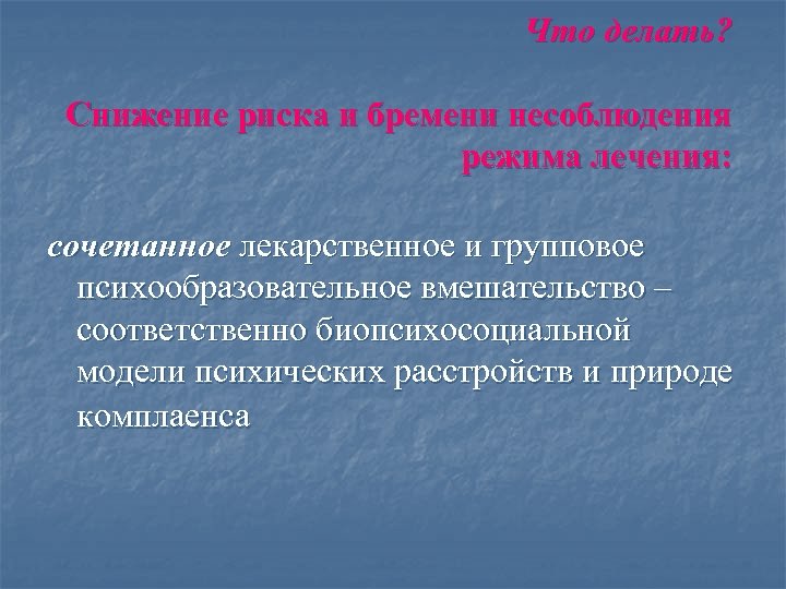 Что делать? Снижение риска и бремени несоблюдения режима лечения: сочетанное лекарственное и групповое психообразовательное вмешательство – соответственно биопсихосоциальной модели психических расстройств и природе комплаенса