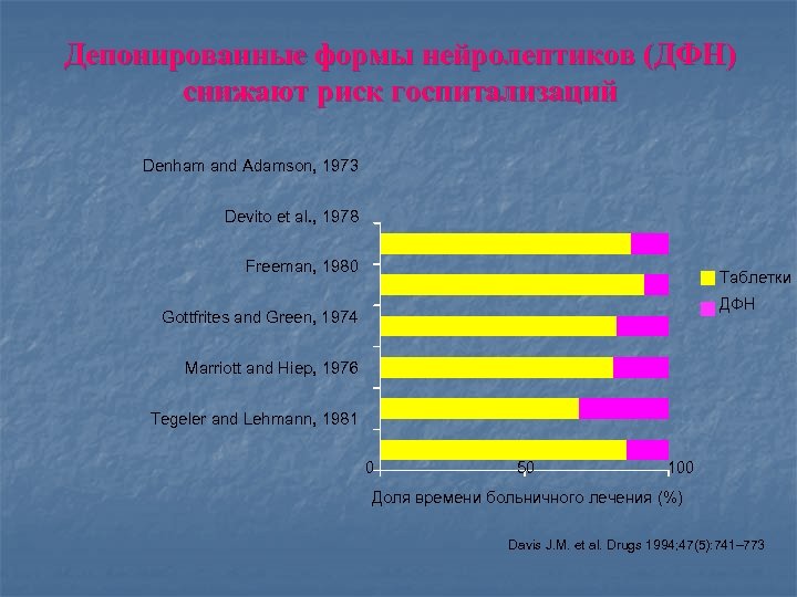 Депонированные формы нейролептиков (ДФН) снижают риск госпитализаций Denham and Adamson, 1973 Devito et al. , 1978 Freeman, 1980 Таблетки ДФН Gottfrites and Green, 1974 Marriott and Hiep, 1976 Tegeler and Lehmann, 1981 0 50 100 Доля времени больничного лечения (%) Davis J. M. et al. Drugs 1994; 47(5): 741– 773
