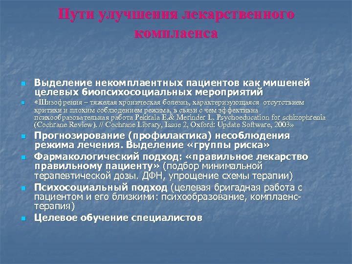 Пути улучшения лекарственного комплаенса n n n Выделение некомплаентных пациентов как мишеней целевых биопсихосоциальных мероприятий «Шизофрения – тяжелая хроническая болезнь, характеризующаяся отсутствием критики и плохим соблюдением режима, в связи с чем эффективна психообразовательная работа Pekkala E. & Merinder L. Psychoeducation for schizophrenia (Cochrane Review). // Cochrane Library, Issue 2, Oxford: Update Software, 2003» Прогнозирование (профилактика) несоблюдения режима лечения. Выделение «группы риска» Фармакологический подход: «правильное лекарство правильному пациенту» (подбор минимальной терапевтической дозы. ДФН, упрощение схемы терапии) Психосоциальный подход (целевая бригадная работа с пациентом и его близкими: психообразование, комплаенстерапия) Целевое обучение специалистов