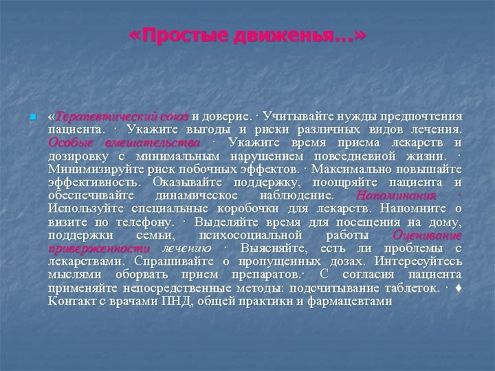 «Простые движенья…» n «Терапевтический союз и доверие. · Учитывайте нужды предпочтения пациента. · Укажите выгоды и риски различных видов лечения. Особые вмешательства · Укажите время приема лекарств и дозировку с минимальным нарушением повседневной жизни. · Минимизируйте риск побочных эффектов. · Максимально повышайте эффективность. Оказывайте поддержку, поощряйте пациента и обеспечивайте динамическое наблюдение. Напоминания · Используйте специальные коробочки для лекарств. Напомните о визите по телефону. · Выделяйте время для посещения на дому, поддержки семьи, психосоциальной работы Оценивание приверженности лечению · Выясняйте, есть ли проблемы с лекарствами. Спрашивайте о пропущенных дозах. Интересуйтесь мыслями оборвать прием препаратов. · С согласия пациента применяйте непосредственные методы: подсчитывание таблеток. · ♦ Контакт с врачами ПНД, общей практики и фармацевтами