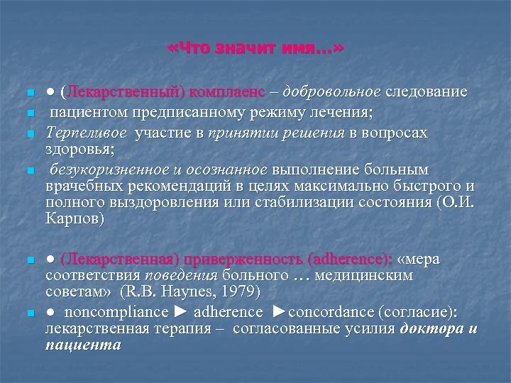 «Что значит имя…» n n n ● (Лекарственный) комплаенс – добровольное следование пациентом предписанному режиму лечения; Терпеливое участие в принятии решения в вопросах здоровья; безукоризненное и осознанное выполнение больным врачебных рекомендаций в целях максимально быстрого и полного выздоровления или стабилизации состояния (О. И. Карпов) ● (Лекарственная) приверженность (adherence): «мера соответствия поведения больного … медицинским советам» (R. B. Haynes, 1979) ● noncompliance ► adherence ►concordance (согласие): лекарственная терапия – согласованные усилия доктора и пациента