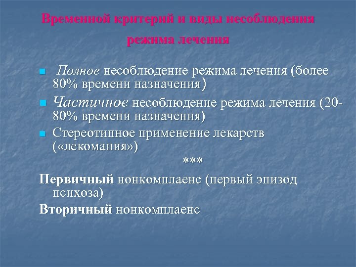 Временной критерий и виды несоблюдения режима лечения Полное несоблюдение режима лечения (более 80% времени назначения) n Частичное несоблюдение режима лечения (2080% времени назначения) n Стереотипное применение лекарств ( «лекомания» ) *** Первичный нонкомплаенс (первый эпизод психоза) Вторичный нонкомплаенс n