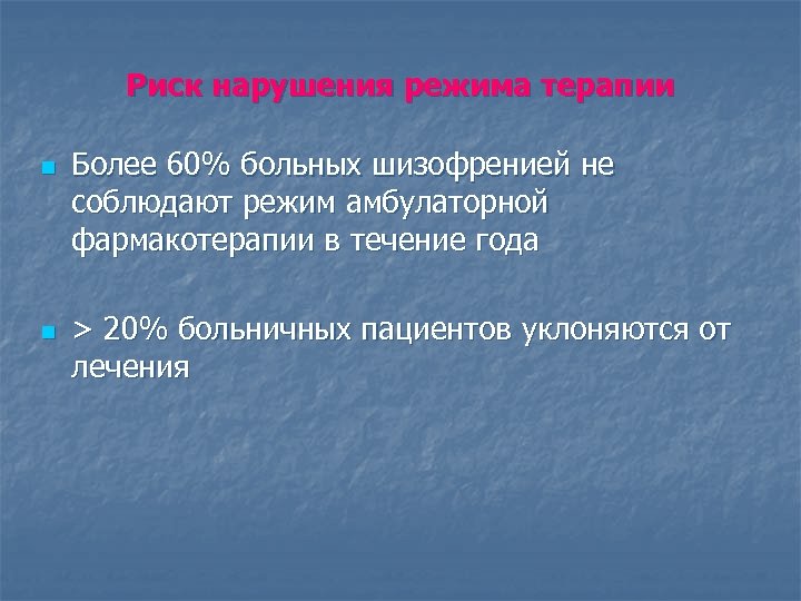 Риск нарушения режима терапии n n Более 60% больных шизофренией не соблюдают режим амбулаторной фармакотерапии в течение года > 20% больничных пациентов уклоняются от лечения