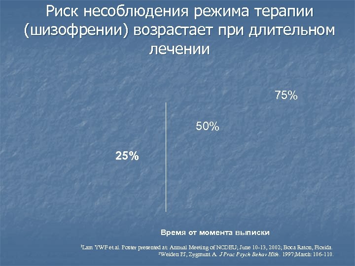 Риск несоблюдения режима терапии (шизофрении) возрастает при длительном лечении 75% 50% 25% Время от момента выписки 1 Lam YWF et al. Poster presented at: Annual Meeting of NCDEU; June 10 -13, 2002; Boca Raton, Florida. 2 Weiden PJ, Zygmunt A. J Prac Psych Behav Hlth. 1997; March: 106 -110.