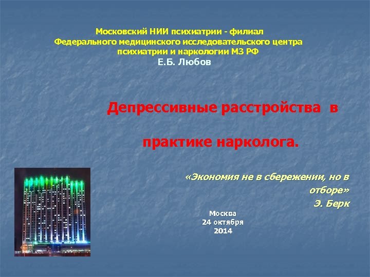 Московский НИИ психиатрии - филиал Федерального медицинского исследовательского центра психиатрии и наркологии МЗ РФ Е. Б. Любов Депрессивные расстройства в практике нарколога. «Экономия не в сбережении, но в отборе» Э. Берк Москва 24 октября 2014
