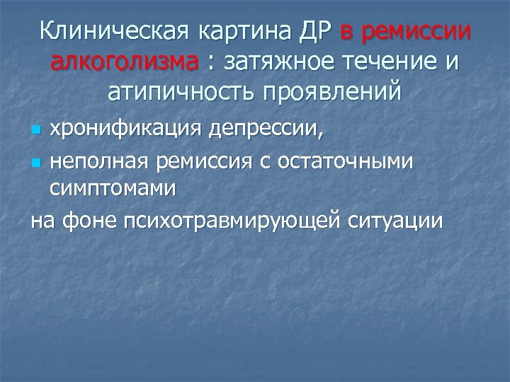Клиническая картина ДР в ремиссии алкоголизма : затяжное течение и атипичность проявлений хронификация депрессии, n неполная ремиссия с остаточными симптомами на фоне психотравмирующей ситуации n