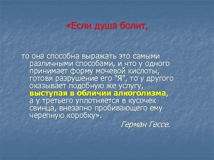 «Если душа болит, то она способна выражать это самыми различными способами, и что у одного принимает форму мочевой кислоты, готовя разрушение его "Я", то у другого оказывает подобную же услугу, выступая в обличии алкоголизма, а у третьего уплотняется в кусочек свинца, внезапно пробивающего ему черепную коробку» . Герман Гессе.